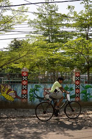A child pedals past vibrant murals, his small frame popping against a wall of color and culture.